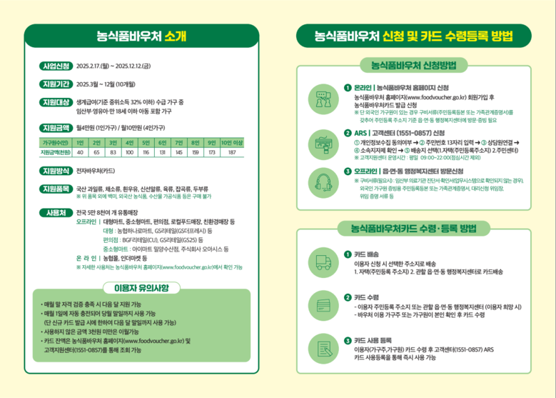 석성균 강원특별자치도 농정국장은 “농식품 바우처 사업 추진을 통해 취약계층의 먹거리 안전망을 더욱 강화할 수 있게 되었다”며, “지원 대상 가구가 빠르게 신청하여 양질의 먹거리 지원 혜택을 누리길 바란다”고 밝혔다.
