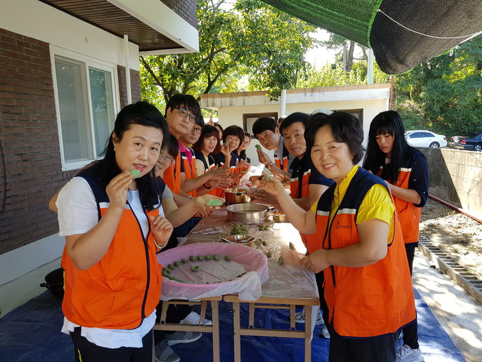 이날 밑반찬 봉사에는 주말에도 회원 100여명이 참석하여 송편과 나박김치를 정성스럽게 만들었다.