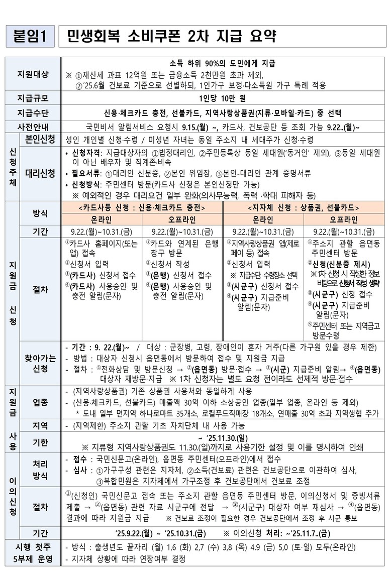 이번 소비쿠폰은 소득 하위 90% 도민에게 지급되며, 2025년 6월 건강보험료 기준(장기요양보험료 제외) 가구별 합산액이 선정 기준 이하일 경우 해당된다. 단, 2024년 재산세 과세 표준 12억 원 이상이거나 금융소득 2천만 원 이상인 경우는 제외된다. 2차 지급 금액은 1인당 10만 원이다.