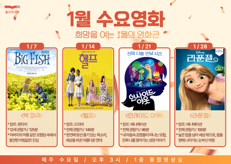 ▲1월 7일 아버지의 모험담 속에서 진심을 발견하는 <빅 피쉬>를 시작으로 ▲1월 14일 <헬프> ▲1월 21일 <인사이드 아웃> ▲1월 28일 <라푼젤>이 차례로 상영될 예정이다.