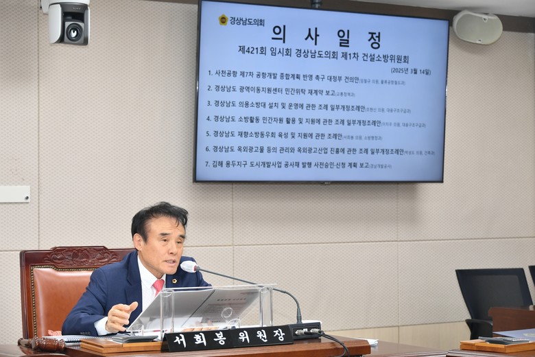 [경남 세계타임즈=최성룡 기자] 경상남도의회 건설소방위원회 서희봉(국민의힘, 김해2) 위원장이 퇴직 소방공무원의 친목도모와 지역사회 공익활동을 지원하기 위해 대표발의한 ‘경상남도 재향소방동우회 육성 및 지원에 관한 조례안’이 14일 건설소방위원회를 통과했다.