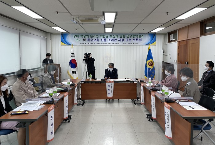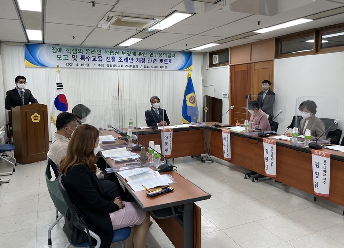 이날 토론회는 「충청북도교육청 특수교육진흥 조례」제정을 위한 의견 수렴을 위한 것으로, 교육위원회 임동현(청주) 의원이 좌장을 맡았고 김현진 청주대학교 교수가 「장애학생의 온라인 학습권 보장에 관한 연구용역」의 연구 결과를 발표했다.