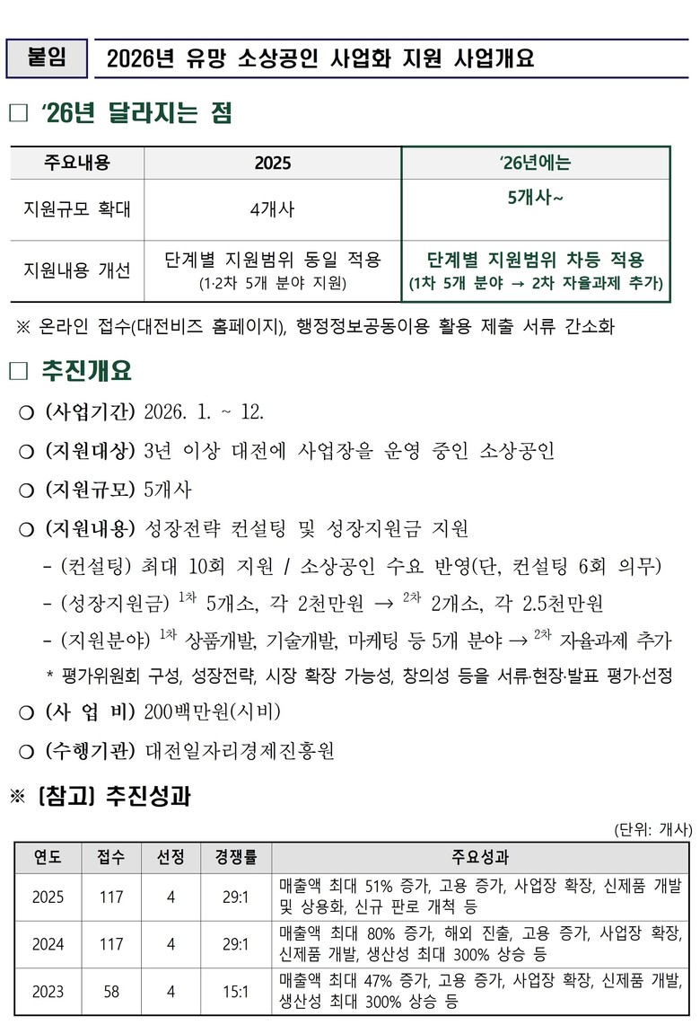 모집 기간은 2월 25일까지로, 대전에서 3년 이상 사업장을 운영 중인 소상공인을 대상으로 서류심사, 현장 확인, 발표심사 등을 거쳐 5개 업체를 최종 선정한다.