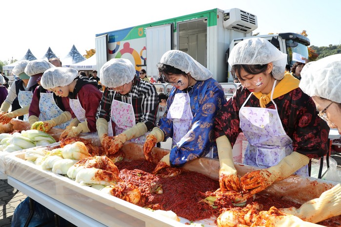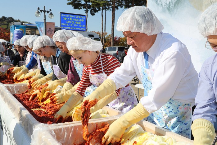 [외국인과 김치담그기] 19일(금) 서울월드컵경기장 평화의 광장에서 '제11회 마포나루 새우젓 축제'가 열렸다. 이날 유동균 마포구청장은 연세학당 대학생과 연남글로벌빌리지 및 마포구 거주 외국인들이 함께한 '외국인과 함께하는 김치담그기'프로그램에 참여했다.