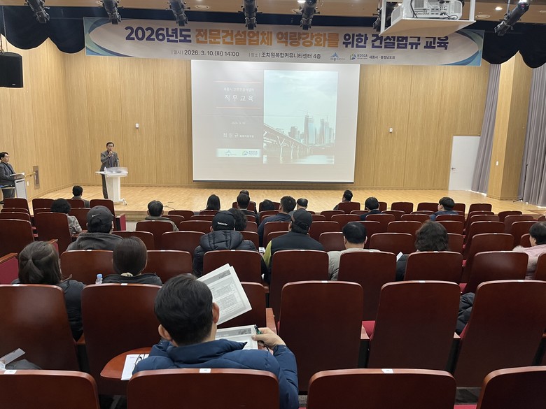 [세종 세계타임즈=이채봉 기자] 세종특별자치시(시장 최민호)가 지난 10일 조치원 복합커뮤니티센터에서 대한전문건설협회 세종시·충남도회 회원사 및 관계자를 대상으로 건설법규 교육을 진행했다.