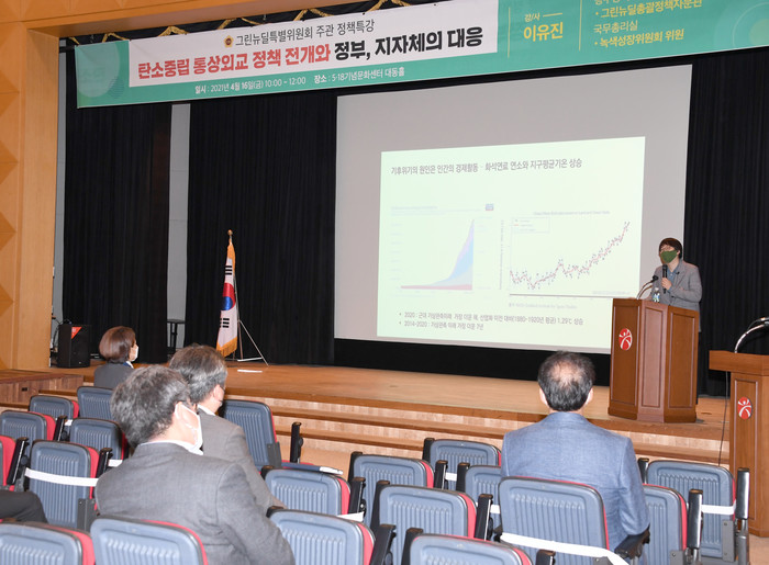 이날 특강에서 이유진 박사는 탄소중립을 위한 각 국가의 정책소개와 정부의 그린뉴딜 5대 대표과제 및 탄소중립 사회혁신 방안, 2050 탄소중립을 위한 추진전략, 탄소중립을 위한 한국사회 및 지방정부의 과제와 대응방안에 대해 참석자들과 내용을 공유했다.