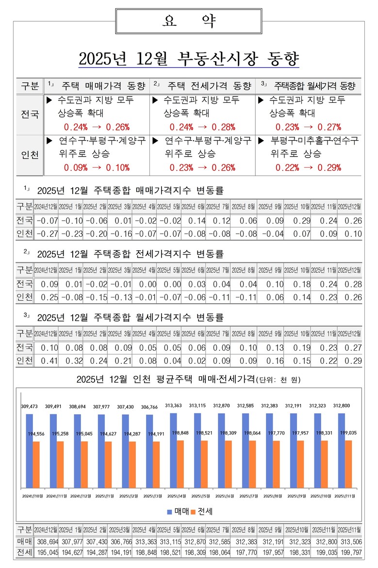 인천시가 한국부동산원의 부동산 통계정보를 분석한 ‘2025년 12월 부동산시장 동향 보고서’에 따르면, 12월 인천의 주택 매매가격지수 변동률은 전월 0.09%에서 0.10%로 상승폭이 확대됐다. 지역별로는 연수구(0.16%→%0.36), 부평구(0.07%→0.08%), 계양구(0.06%→0.07%)는 상승했으나, 동구(0.14%→0.04%), 서구(0.10%→0.04%), 남동구(0.09%→0.07%), 중구(0.09%→0.07%), 미추홀구(0.05%→0.03%)는 하락했다.