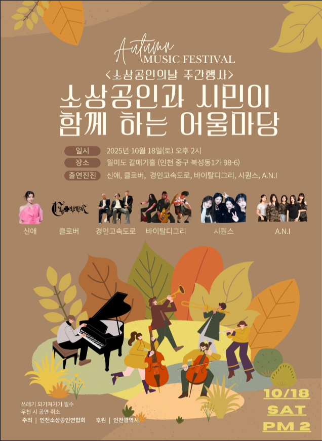 또한, 행사 첫날인 10월 18일 오후 2시부터 4시까지는 월미도 갈매기홀에서 ‘어울마당 음악회’가 열린다. 신애, 클로버, 경인고속도로 등 6개 팀이 공연을 펼치며, 소상공인과 시민이 함께 어우러져 즐기는 문화 교류의 무대가 마련된다.