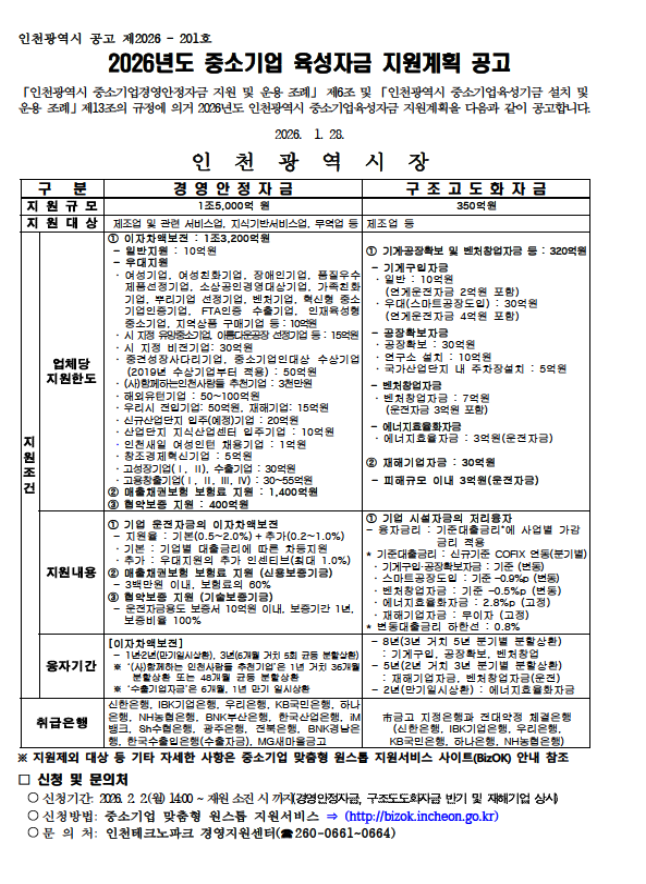 중소기업 육성자금 지원을 희망하는 기업은 2월 2일부터 인천시 중소기업 맞춤형 지원 시스템 ‘비즈오케이(BizOK)’(http://bizok.incheon.go.kr)를 통해 신청할 수 있다. 자세한 내용은 인천시 누리집 고시·공고에서 확인 가능하며, 기타 문의는 인천테크노파크(☎ 260-0661~4)로 하면 된다.