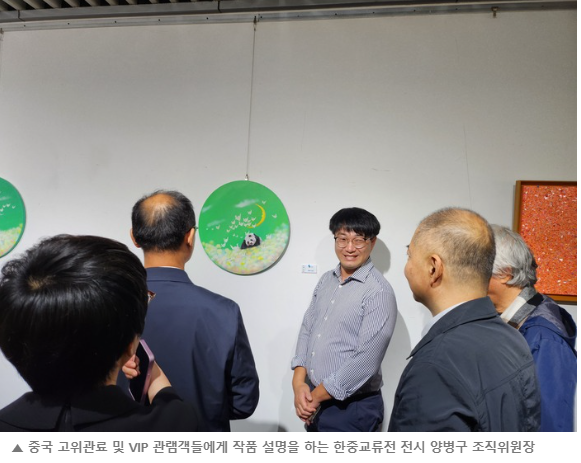▲ 중국 고위관료 및 VIP 관램객들에게 작품 설명을 하는 한중교류전 전시 양병구 조직위원장