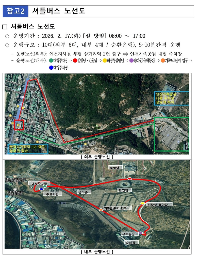 특히 2월 17일 설 당일에는 성묘객의 이동 편의를 위해 인천가족공원 내외부를 순환하는 무료 셔틀버스 10대를 오전 8시부터 오후 5시까지 운영하며, 노선은 외부순환과 내부순환으로 구분해 운행한다.