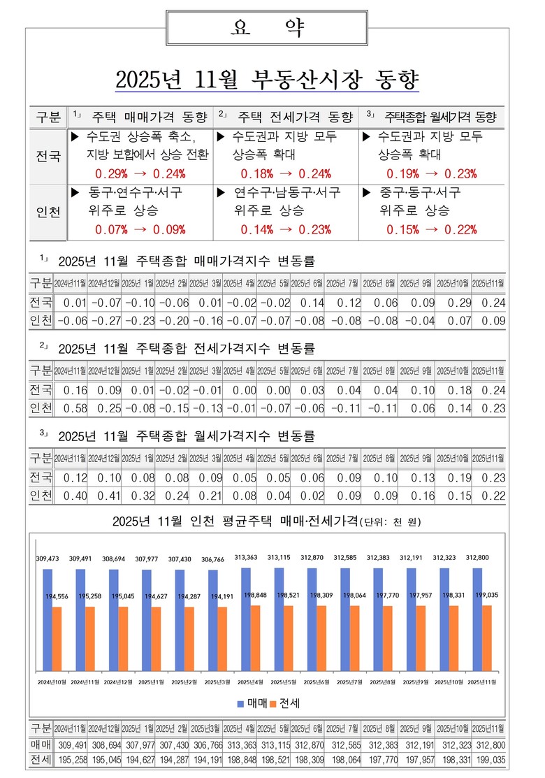 인천시가 한국부동산원의 부동산 통계정보를 분석한 ‘2025년 11월 부동산시장 동향 보고서’에 따르면, 11월 인천의 주택 매매가격지수 변동률은 전월 0.07%에서 0.09%로 상승폭이 확대됐다. 지역별로는 연수구(0.02%→%0.16), 동구(0.11%→0.14%), 서구(0.13%→0.10%), 남동구(0.03%→0.09%), 중구(0.05%→0.09%), 부평구(0.07%→0.07%), 계양구(0.05%→0.06%), 미추홀구(0.04%→0.05%) 순으로 상승했다.