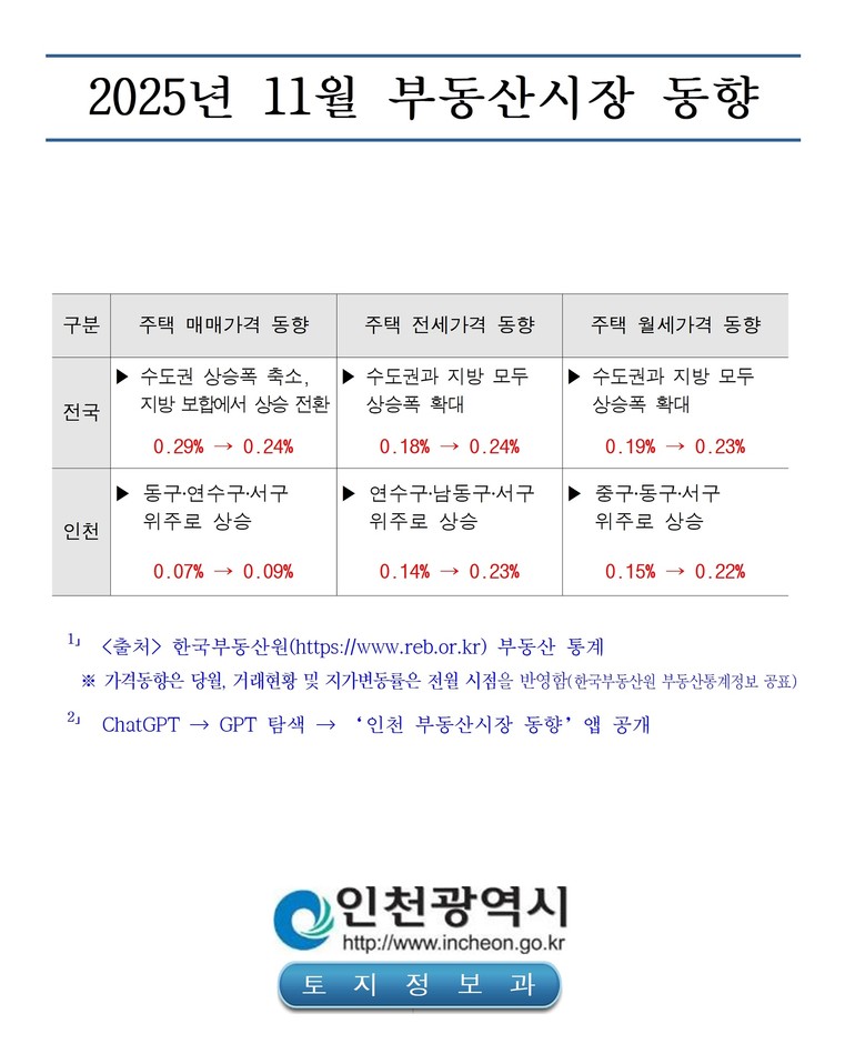 한편, 인천시는 시민들이 인천 부동산 시장 동향을 보다 쉽고 편리하게 파악할 수 있도록 ‘ChatGPT’의 ‘인천 부동산시장 동향’ 앱을 통해 지역별 주택 매매‧전월세 가격 변동률, 거래량, 아파트 매매‧전월세‧분양‧입주권 실거래가 등을 실시간 맞춤형 대화로 제공하고 있다.