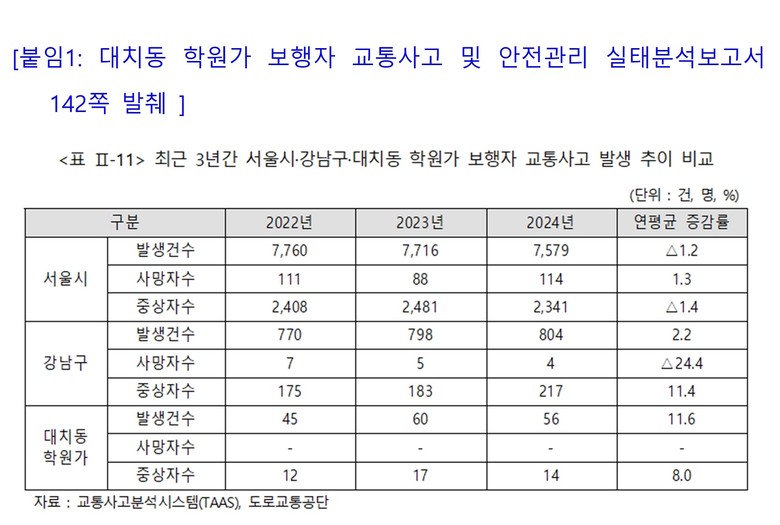 서울특별시의회 윤영희 의원(국민의힘, 비례)이 제안하고 서울시 재정분석담당관이 분석한 자료에 따르면, 최근 3년간(2022~2024년) 서울시 전체 보행자 교통사고 발생 건수는 연평균 1.2% 감소한 반면, 대치동 학원가 일대 보행자 사고는 2022년 45건에서 2024년 56건으로 늘어나는 등 연평균 11.6% 증가해 뚜렷한 대비를 보였다.