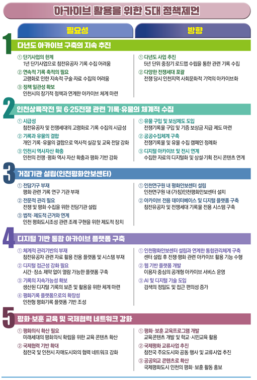 더불어 아카이브 사업의 지속가능성과 확산을 위해 △다년도 사업 전환, △참전·생활사 기록 수집 확대, △‘인천평화안보센터(가칭)’ 설립, △통합형 디지털 플랫폼 구축, △평화·보훈 교육 및 국제협력 활용 등 5대 정책제언도 함께 제시했다.