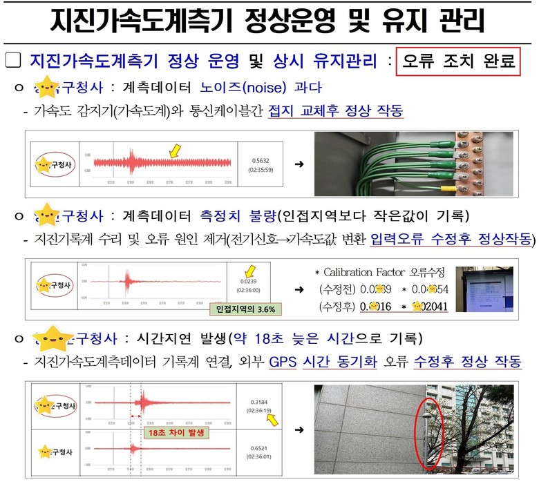 첫 번째로 지진과 관계없는 수많은 전자파와 전기 에너지가 기기의 센서와 회로에 영향을 주는 노이즈 문제이며 접지로 제거하지 못한 시스템이 운영되고 있었고 두 번째, 아날로그 데이터를 실제 물리량과 일치하도록 보정하는 캘리브레이션 대응 상수의 적용이 잘못된 자치구 지진 계측 시스템이 있었다.