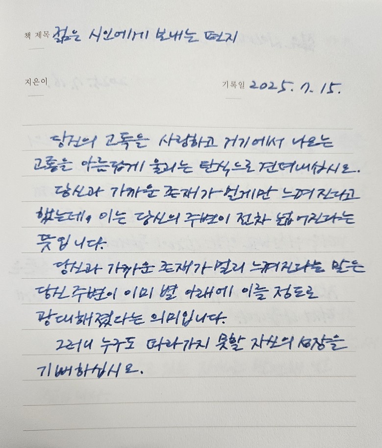『논어』(공자), 『그리스인 조르바』(니코스 카잔차키스), 『젊은 시인에게 보내는 편지』(라이너 마리아 릴케), 『월든』(헨리 데이비드 소로우) 등 고전 속 의미 있는 문장을 한 글자 한 글자 써 내려가는 실천을 통해 인문학을 단순한 지식이 아닌 ‘삶의 태도’로 체화하는 시간으로 자리 잡았다.