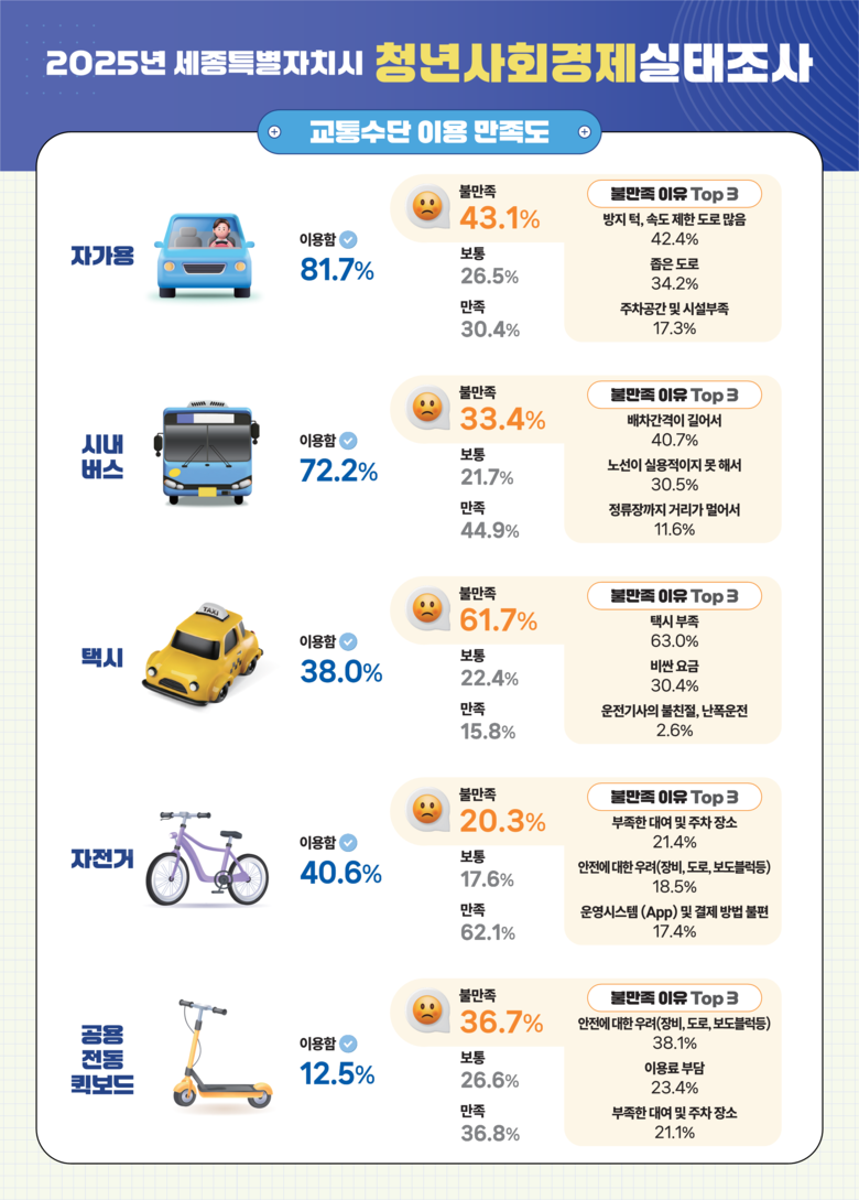 시내버스(BRT 포함) 이용률은 72.2%로 2022년 63.9%과 비교해 증가했으나 배차간격에 대한 불만이 높아 개선이 필요한 것으로 조사됐다.