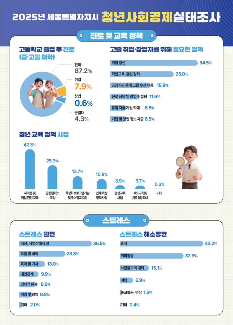이번 2025년 세종시 청년사회경제실태조사와 관련된 자세한 내용은 세종통계포털(www.sejong.go.kr/stat) 내 ‘통계간행물-청년사회경제실태조사’ 게시판에서 확인할 수 있다.
