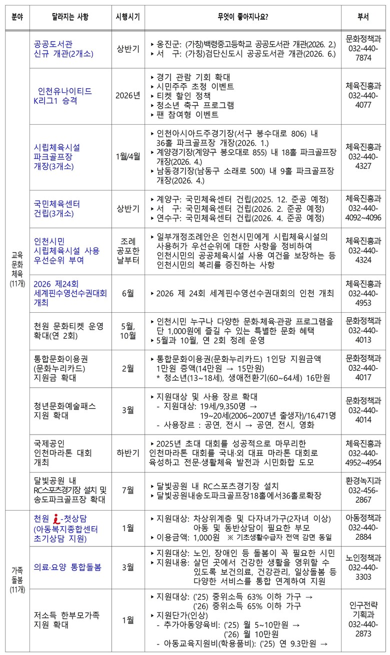 교육·문화·체육 분야에서도 생활 밀착형 인프라가 확충된다. 옹진군(백령중·고등학교)과 서구(검단신도시)에 공공도서관 각 1개소를 신규 조성하고, 인천유나이티드의 K리그1 승격에 따라 시민과 구단이 함께하는 다양한 혜택을 제공한다. 아울러 서구(아시아드경기장), 계양구(계양경기장), 남동구(남동경기장)에 파크골프장 각 1개소를 신규 개장하고, 계양구·서구·연수구에는 국민체육센터를 조성해 지역 생활체육 활성화를 도모한다.