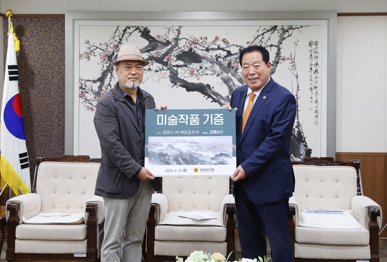 [충남 세계타임즈=백택기 기자] 충남도의회 홍보대사로 활동 중인 인주(仁州) 박진균 화백이 도민의 안녕과 도의회의 발전을 기원하며 수묵화 미술작품을 의회에 기증했다.