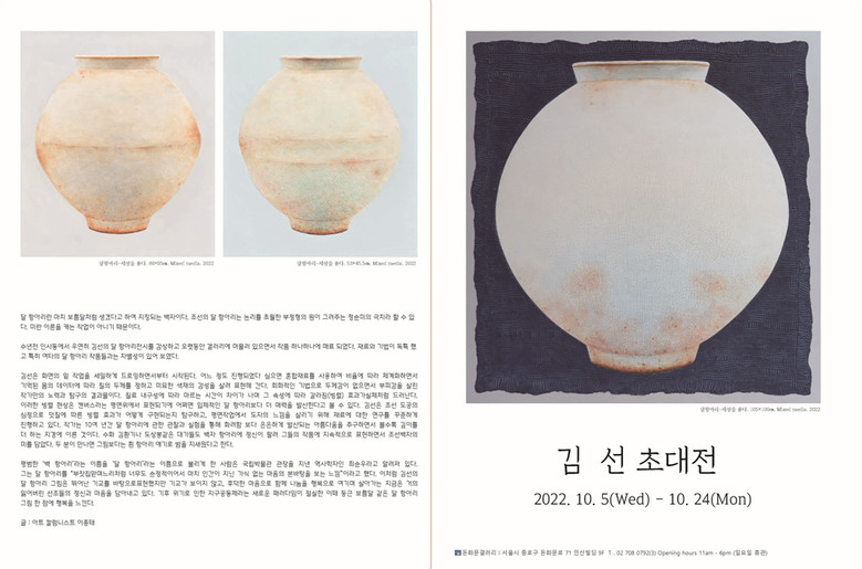 [세계타임즈=김광수 기자] 조선 백자 달항아리를 캔버스에 옮겨 단아하면서 우아한 조형미를 뽐내는 작품으로 한국 미술계에 주목받고 있는 김선 작가는 2022년 10월 5일(수) ~ 10월 24일(월)까지 서울 종로구 소재의 돈화문갤러리(관장 안명혜)에서 초대 개인전을 진행 중에 있다. 단순한 달항아리의 모습을 하고 있지만 은근히 발산되는 청초한 아름다움이 시선을 사로잡는다. 화려하지 않지만 달항아리의 고운 자태에 감상하는 시간이 늘어나고, 밝은 보름달에 비친 듯 옅은 옥빛 색깔에 매료된다. 작가는 조선의 대표적 미술품 백자의 기품을 간직한 채 재현하여 옛 장인들의 기술이 옮겨온 듯 재미있다.