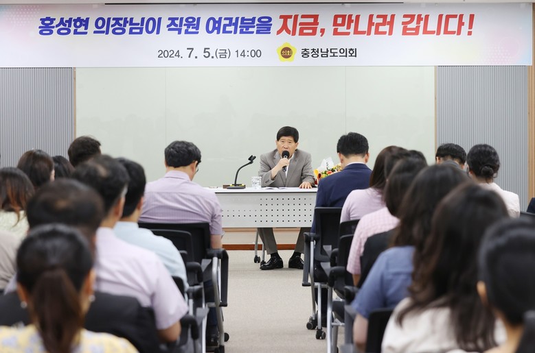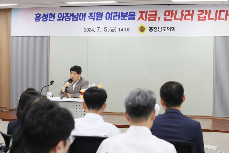 [충남 세계타임즈=백택기 기자] 충남도의회 홍성현 의장(천안1‧국민의힘)이 5일 후반기 의회 출범을 맞아 의회 운영 방안을 공유하고자 사무처 전 직원과 소통의 시간을 가졌다.