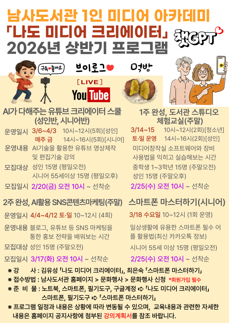 프로그램은 ▲초등 유튜브 크리에이터 방학캠프 ▲1주 완성, 도서관 스튜디오 체험교실(청소년·성인) ▲2주 완성, 인공지능(AI) 활용 사회관계망서비스(SNS) 콘텐츠 마케팅 ▲AI가 다해주는 유튜브 크리에이터 스쿨(성인·시니어) ▲스마트폰 마스터하기 등이다.