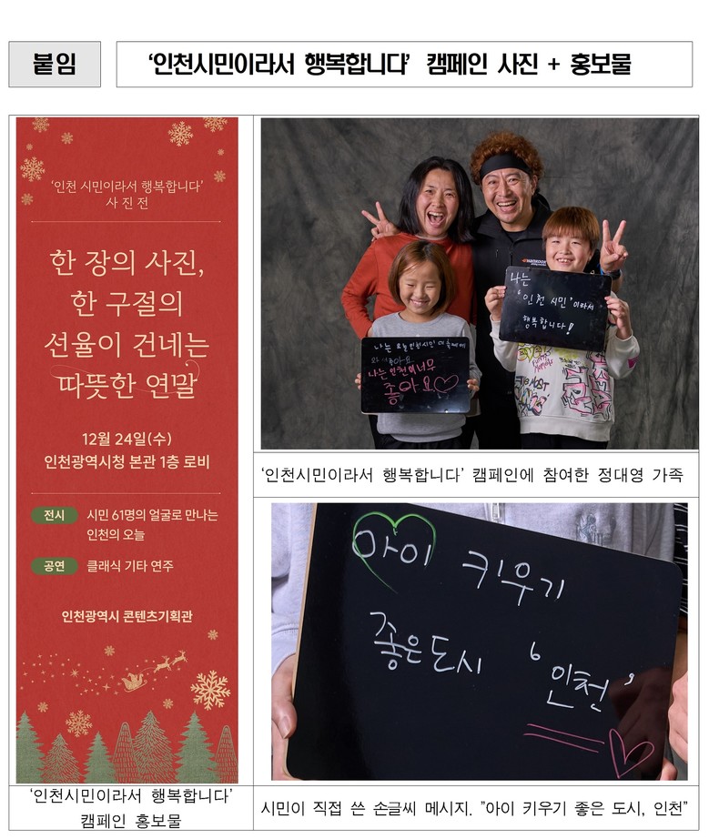 이번 사진전은 지난 10월 11일 열린 제61회 인천시민의 날 행사에서 진행된 ‘인천 시민이라서 행복합니다’ 캠페인의 연장선으로 마련됐다. 당시 주부와 직장인, 은퇴자, 외국인 주민 등 다양한 계층의 시민 61명이 ‘무엇 때문에 인천시민이라서 행복한가요?’라는 질문에 손글씨로 답하고 사진 촬영에 참여했다.