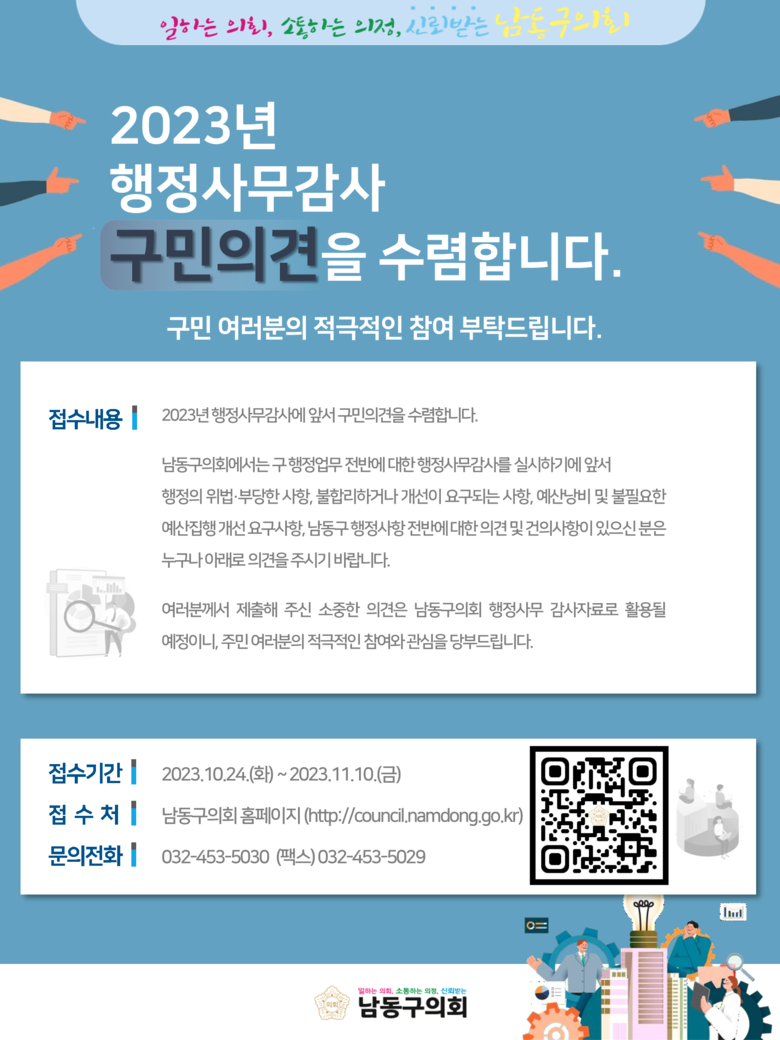 ‘행정사무감사’ 는 의회의 집행부 감시권의 하나로, 남동구의회는 11월 개최 예정인 제290회 제2차 정례회에서 남동구에 대한 행정사무감사를 실시할 예정이다. 이에 앞서 구의회는 구민들로부터 다양한 제보와 의견을 접수받아 이번 행정사무감사에 반영하고자 한다.
