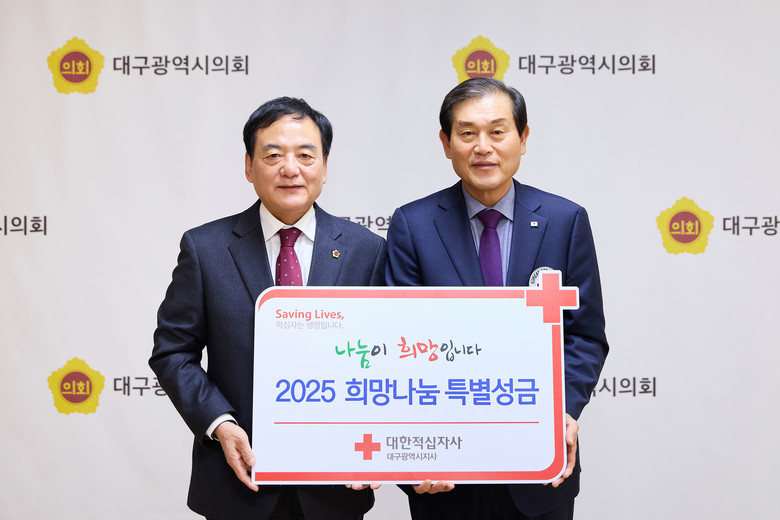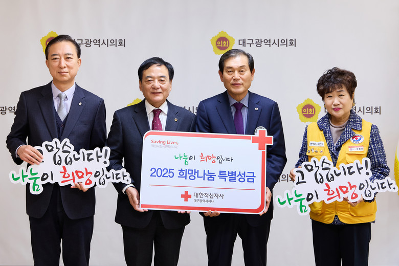 [대구 세계타임즈=한윤석 기자] 대구시의회(의장 이만규)는 12월 13일(금) 14:00 시의회 접견실에서 지역 내 소외계층에 온정을 나누고 기부문화 확산에 앞장서고자 대한적십자사 대구지사에 특별성금을 전달했다.