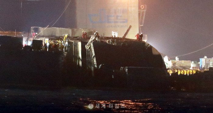 상하이샐비지 선원들이 23일 밤 침몰 해역인 전남 진도 동거차도 앞바다에서 세월호 야간 인양작업을 벌이고 있다. 2017.03.23.