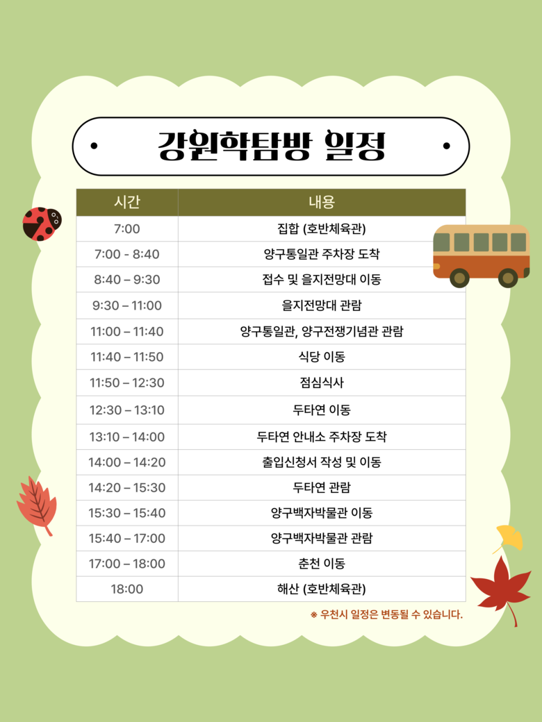 강원특별자치도에서 시행 중인 ‘이달의 지질·생태 명소’ 사업과 연계 추진하여 답사지는 양구로 선정하였으며, 을지전망대·두타연·양구백자박물관 등 방문 예정이다.