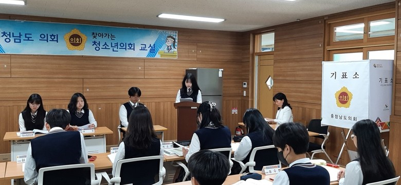 이날 천안 부성중 학생들은 의장 선거에 출마한 학생들의 정견 발표를 들은 후 투표를 통해 의장을 선출하고, 도의원 역할을 경험하며 주민대표의 중요성을 체험했다.