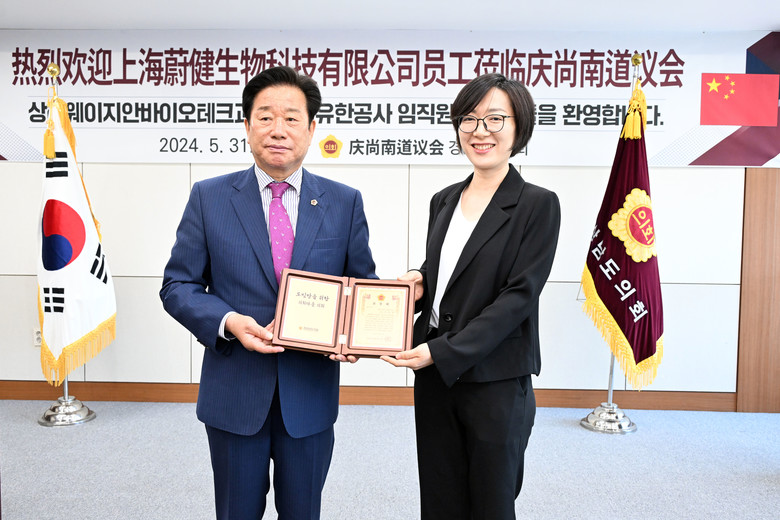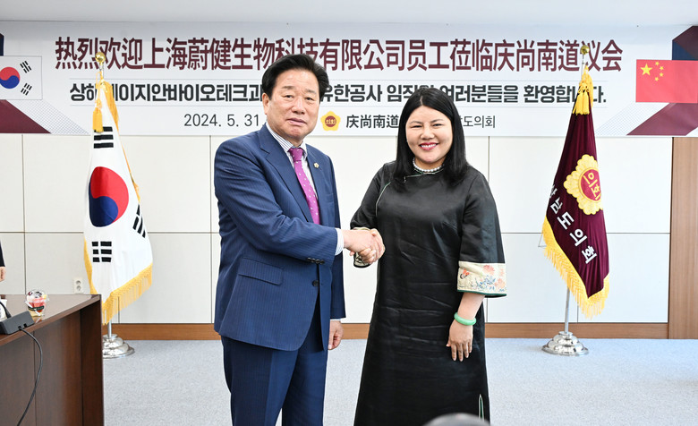 [경남 세계타임즈=최성룡 기자] 경상남도의회(의장 김진부)는 5.31.(금) 오전 도의회 의정회의실에서 중국 상해웨이지안바이오테크과학기술 유한공사(대표 하월) 방한 연수단 30여 명을 초청해 한-중 교류 활성화를 위한 환영회를 개최하였다.