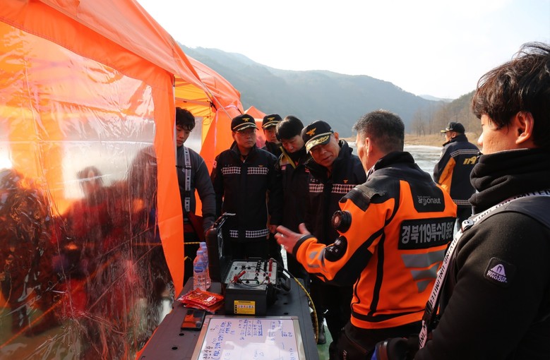 특히 4일부터 6일까지는 안동시 도산면 가송리 고리천 일원에서 실제 겨울철 수난 상황을 가정한 실전 중심의 현장 훈련이 이어졌다. 훈련에서는 ▴빙판을 깨고 입수하는 구조와 인양 절차 ▴수중 수색과 수중 통신 실습 ▴구조대원 위기 상황 발생 시 안전 확보 절차 등을 중점적으로 점검하며 실전 대응 능력 강화에 중점을 뒀다.