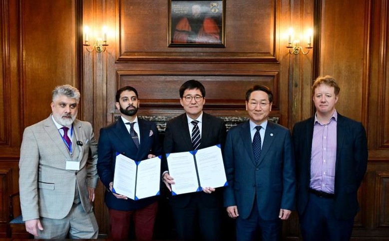| ▲ 25일(현지시간) 영국 케임브리지대학교에서 박성진 인천경제청 투자유치사업본부장(왼쪽)과 오스만 마지드 살로니카 대표가 업무협약을 체결하고 있다 |