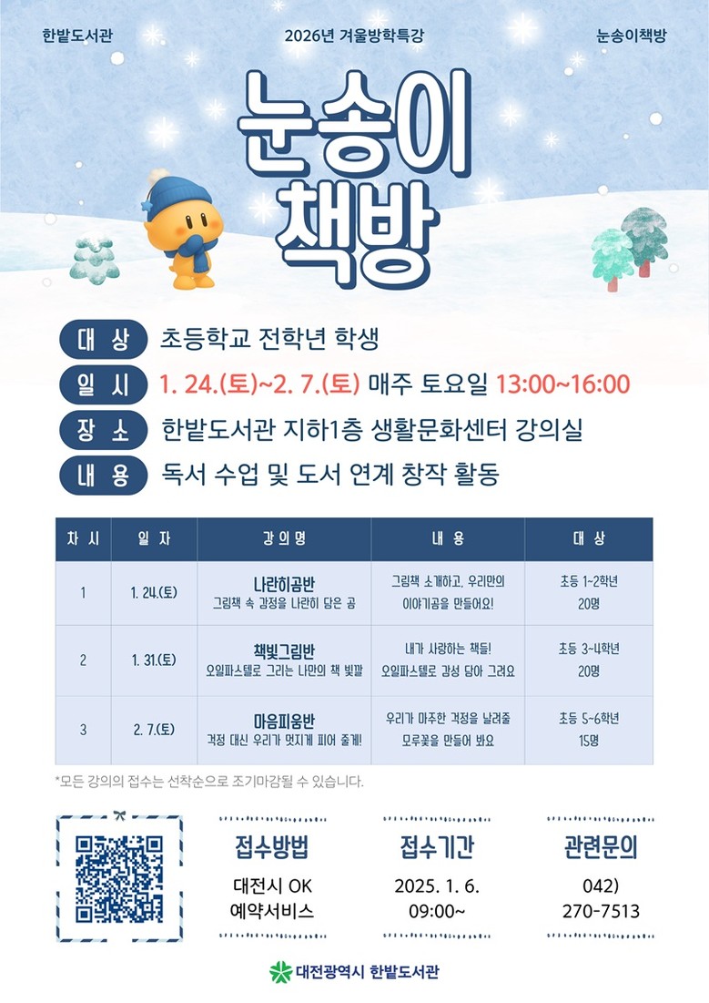 - 초등학생 대상 독서 연계 창작 활동 프로그램 제공 - [대전 세계타임즈=이채봉 기자] 대전 한밭도서관은 겨울방학을 맞아 어린이들의 독서 흥미 고취를 위해 겨울방학특강‘눈송이 책방’을 운영한다.