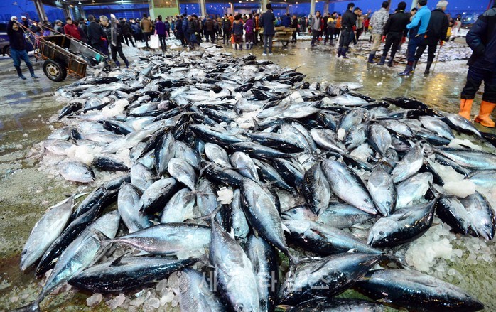 6일 오전 부산 서구 부산공동어시장에서 대형선망어선이 어획한 참다랑어가 경매장으로 옮겨지고 있다. 2017.03.06.