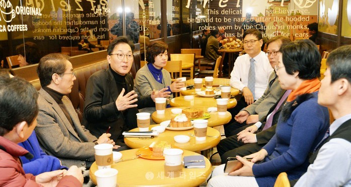 3일 오전 이창우 동작구청장이 서울시 동작구 노량진동 한 커피숍에서 금요일 아침에 인사하는 굿모닝 행정지원국 미팅을 하고 있다. 동작구 관계자는 "지금까지 구청장과 간부들의 공식적인 만남은 구청 회의실 이였으나 기존의 틀에서 벗어나고 자유로운 소통을 위해 자리를 마련했다"고 밝혔다. 2017.03.03. (사진=동작구 제공)