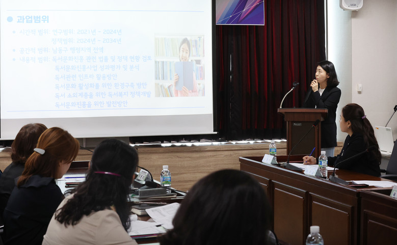 보고회는 연구단체 소개 및 출범 선포, 연구용역 착수 보고, 연구단체 향후 일정 안내 순으로 진행되었으며, 이어서 의원들은 남동구민의 독서역량에 제고와 독서문화환경 조성을 위한 다양한 의견과 아이디어를 제시하며 자연스런 토론을 이어갔다.