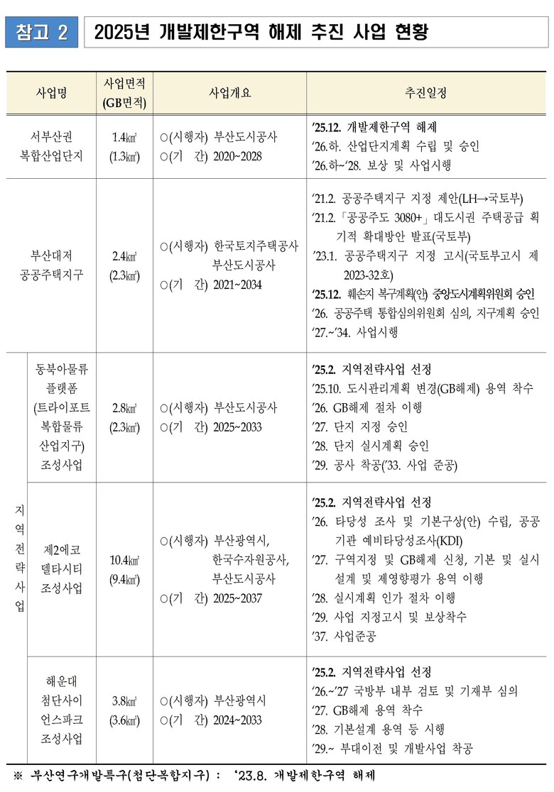 * 서부산권 4곳 : ▴서부산권 복합산업단지(GB 약 1.3㎢) ▴대저 공공주택지구(GB 약 2.3㎢) ▴동북아물류플랫폼(트라이포트복합물류산업지구)(GB 약 2.3㎢) ▴제2에코델타시티(GB 약 9.4㎢)