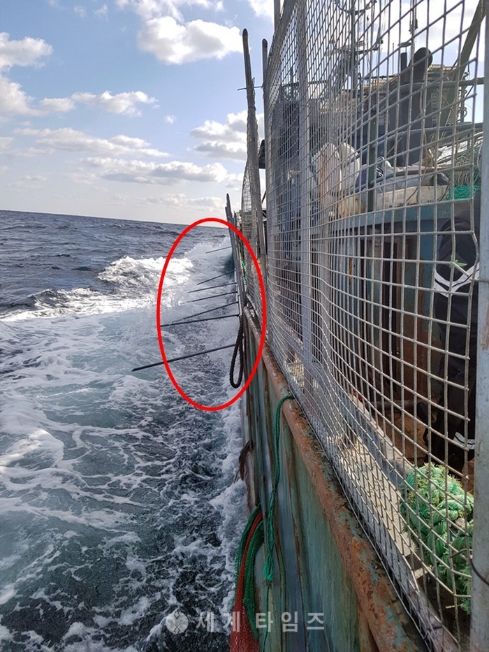해경이 11일 오후 3시께 전북 군산시 어청도 남서쪽 148㎞ 해상에서 100t급 무허가 중국어선 1척을 EEZ 어업법 위반혐의로 붙잡았다. 검거 당시 이 어선은 해양경찰 검문검색을 방해할 목적으로 철망과 쇠창살을 설치하고 있었다. 2017.011.12. (사진= 군산해경 제공)