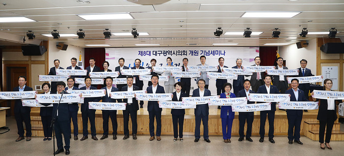 제8대 대구광역시의회는 5대째 써 오던 슬로건을 대신해 ‘시민속으로 한 걸음, 소통하는 민생의회’로 새로운 슬로건을 제정했다. 구호로만 그치는 슬로건을 넘어 시민들에게 더 다가가 시민들과 소통하는 민생의회를 만들겠다는 대구광역시의원 30명의 의지를 담았다.