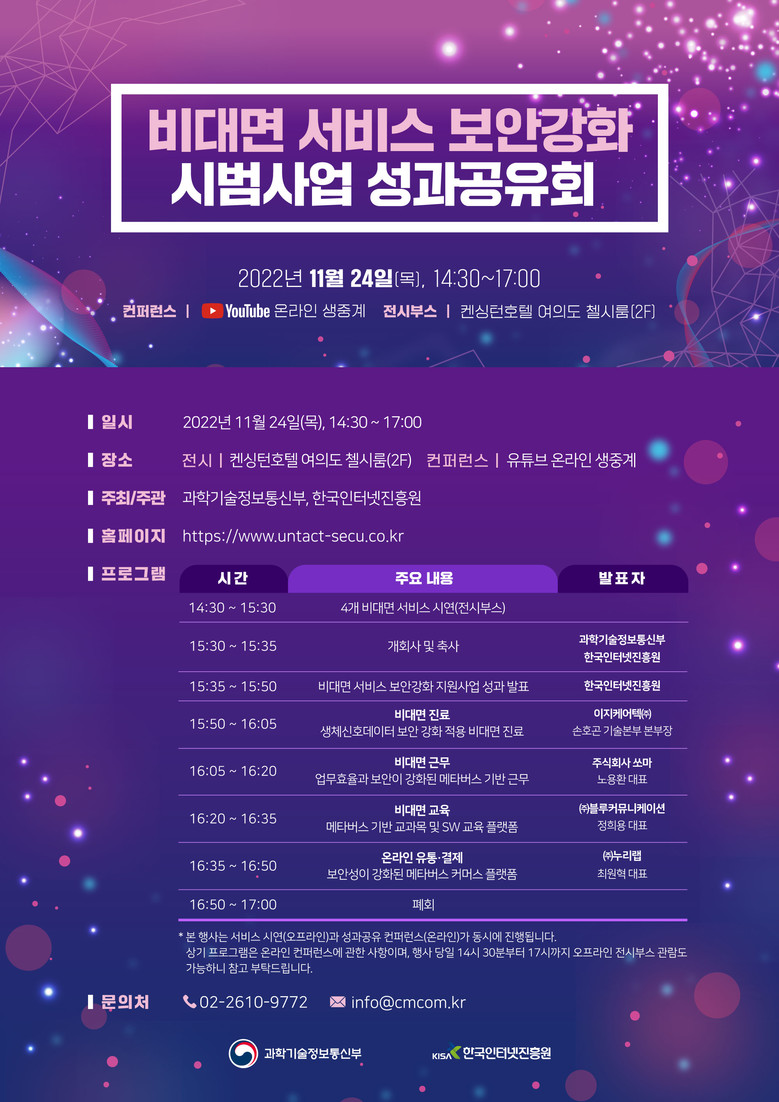 본 행사는 비대면 서비스 및 보안 기술에 관심 있는 누구나 온라인*으로 참여 가능하며, 자세한 내용은 성과공유회 홈페이지**에서 확인할 수 있다.