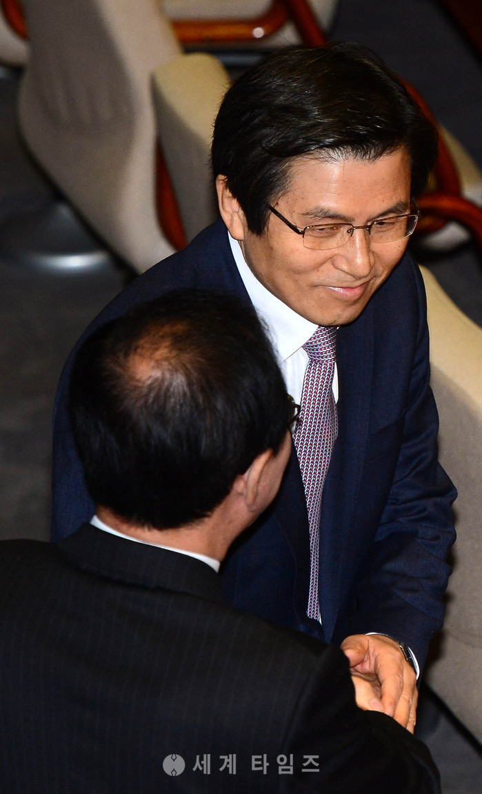 6일 오전 서울 여의도 국회 본회의장에서 열린 제349회 국회 본회의에서 황교안 국무총리 겸 대통령 권한대행이 정의당 노회찬 원내대표와 인사를 나누고 있다. 2017.02.06.