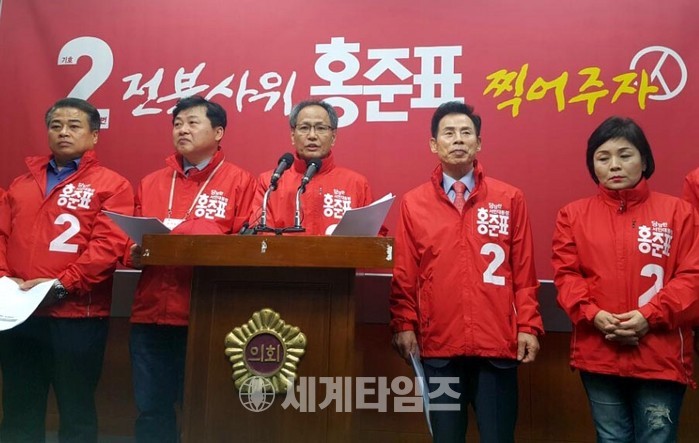 18일 자유한국당 전북도당 선거대책위원회는 전북도의회에서 전북 공약 발표 회견을 열고 "전북의 사위 홍준표를 찍어달라"며 목소리를 높였다. 2017.04.18