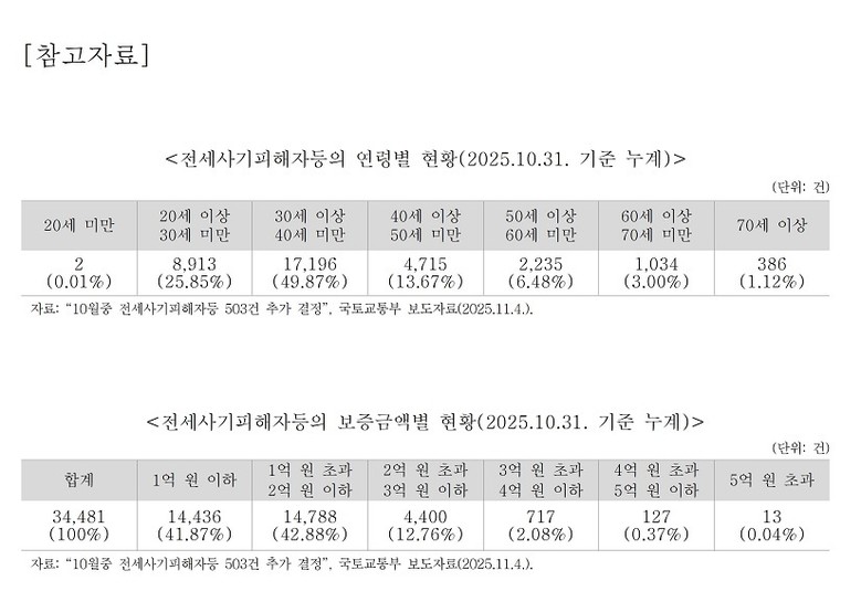 전세사기 피해는 특정 계층의 문제가 아닌 구조적 문제로 확대되고 있다. 국토교통부 자료에 따르면 2025년 10월 기준 전세사기피해자 등으로 결정된 사례는 3만4천여 건에 달하며, 이 가운데 20~30대 청년층이 75.7%를 차지했다. 피해 보증금도 97.5%가 3억 원 이하로, 사회 초년생과 신혼부부 등 주거 기반이 약한 계층에 피해가 집중되는 양상을 보였다.