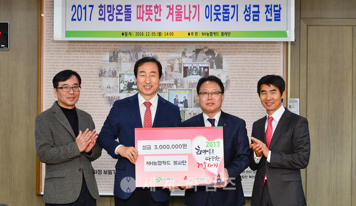 이번에 전달된 성금은 NH농협카드 임직원들이 소외계층 지원을 위해 자발적으로 모금한 것으로 서대문구 ‘2017 희망온돌 따뜻한 겨울나기 이웃돕기 성금’으로 쓰일 예정이다.