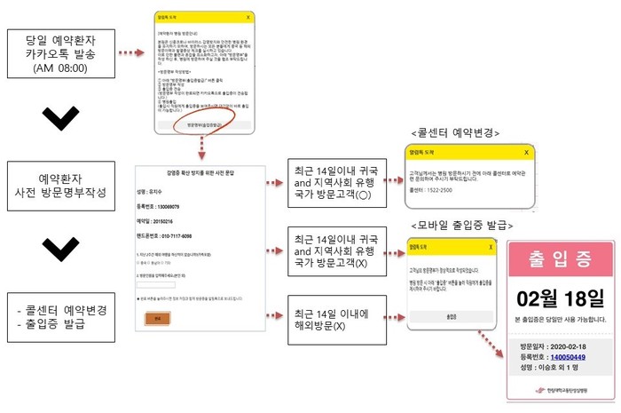 최근 14일 이내에 해외를 방문 이력이 없는 경우 정상적으로 출입증이 발급돼, 병원 입구에서 모바일 출입증을 보여주면 발열 및 호흡기 증상 확인 후 신속한 병원 이용이 가능하다. 만약 14일 이내에 해외를 방문한 경우 병원에 방문하기 전 콜센터를 통해 진료가능 여부를 확인받게 된다.